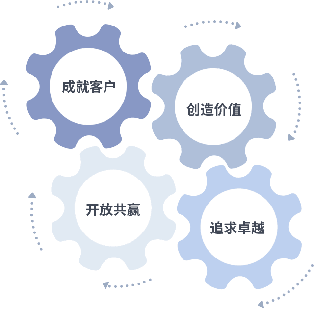 成就客户是一切决策的出发点,,,,创造价值是衡量所有工作的标准,,,,追求卓越是我们做事做人的态度,,,,开放共赢是我们的格局也是最终的结果。。。。价值观的齿轮环环相扣,,,,推动着组织里的每个人不断向前。。。。