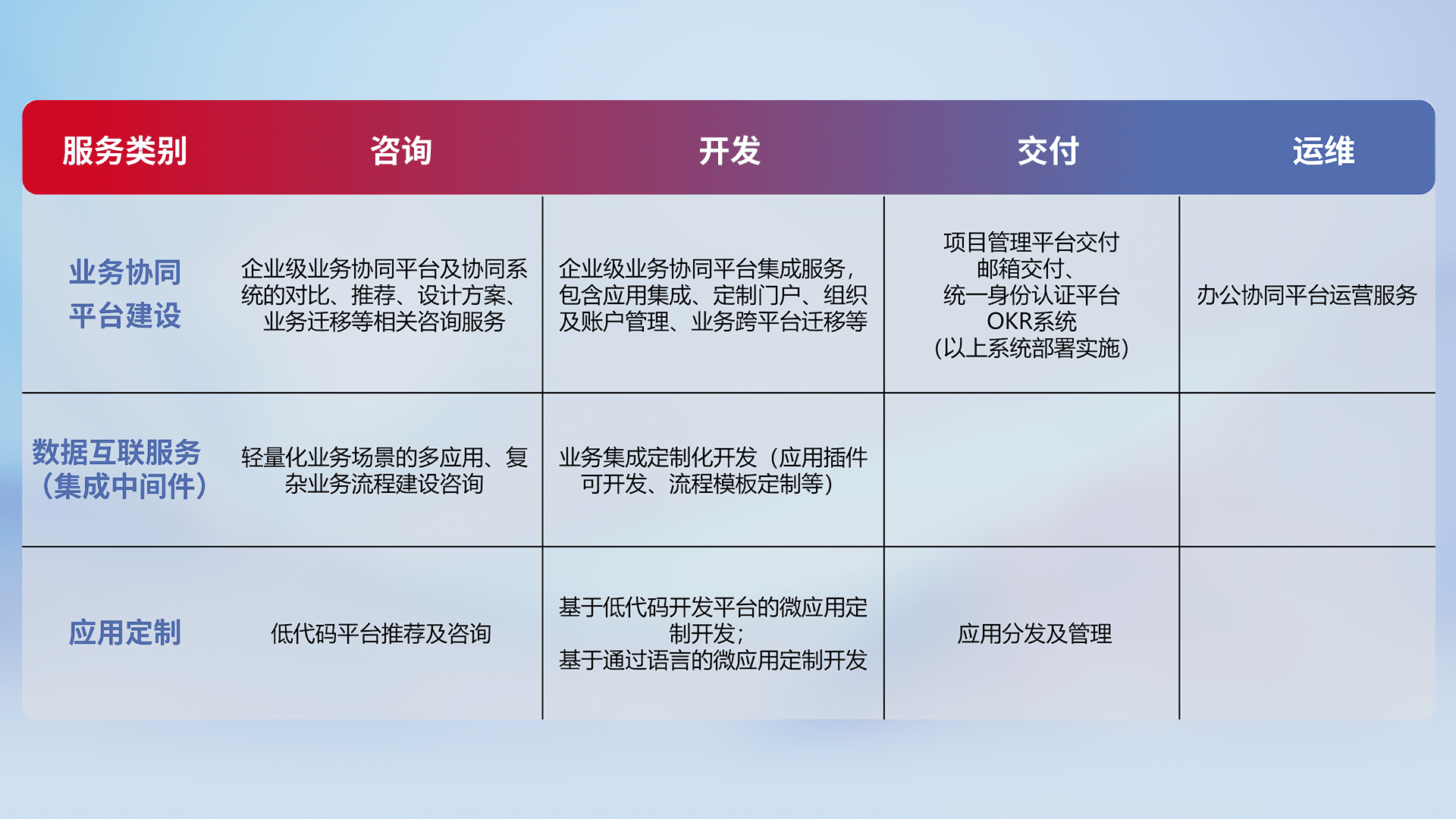 针对钉钉、、、企微、、IDaas等平台级产品提供产品的规划、、、、方案、、、、交付、、、、定制化开发等服务,,,,实现如统一协同办公、、、智能客户服务、、、混合会议管理、、、智能数据查询、、、等业务场景,,实现数字化转型。。。
