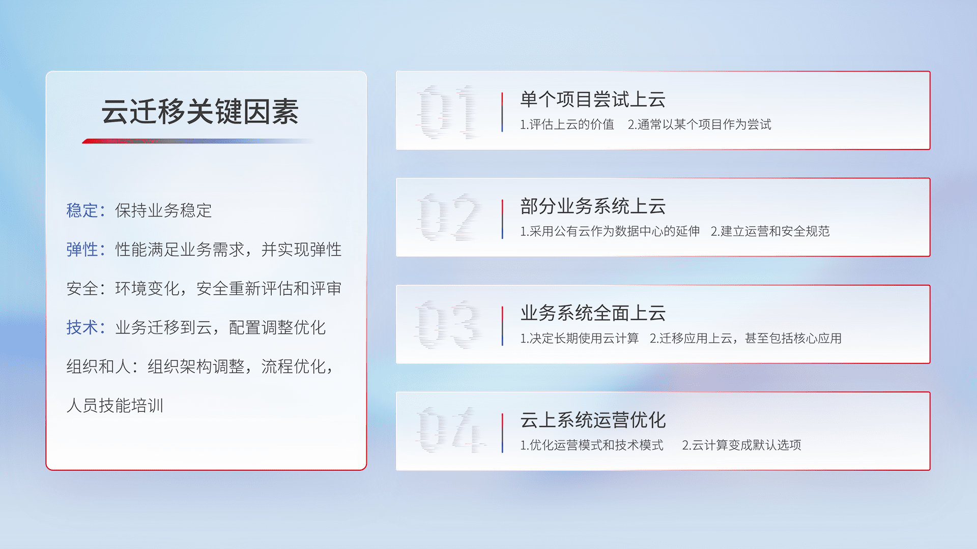 结合实际业务,,,,从规划设计、、、、云平台选型、、、、云原生改造、、、、数据迁移、、、集成交付,,迁移全过程为客户识别最佳上云路径,,,做好风险识别管理,,,,设计网络架构、、身份权限、、、、安全审计合规、、操作审计、、、、日志审计、、监控告警策略、、、、多站点容灾设计等,,对云上基础设施进行整体规划,,,提升IT治理水平,,,以满足弹性、、、高可用、、、、高性能的需求。。。。